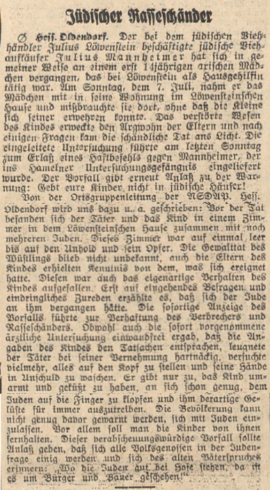 Das in Oldendorf und Umgebung verbreitete, sogar in Bielefeld aufgetauchte Blatt behauptete unter der Überschrift „Unerhörte Rasseschändung im Hause des Juden Löwenstein in Hess. Oldendorf!“, dass ein Angestellter der alteingesessenen Viehhandlung Löwenstein ein 14-jähriges „arisches“ Mädchen vergewaltigt habe. Der hetzerische Text fordert u.a.: „An den Galgen mit dem Juden Mannheimer!“