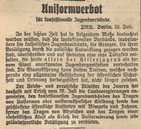 Die Beteiligung dieser Organisationen am Gottesdienst beschränkte sich auf die offiziellen Anlässe wie 30.1.34, läßt auch hier nach. Am 1.5.34 war nur H.J. u. BDM gut vertreten. -