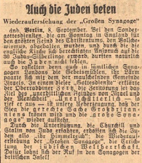 Leider ist es im Kampf gegen Rußland zu Dingen gekommen, die geeignet sind, der christlichen Kirche Schwierigkeiten zu bereiten, so wenn der Erzbischof von Canterbury und sein Prior ihre Stimmen für die Bolschewisten erheben oder wenn selbst Roosevelt im Gebet sich gegen uns wendet. Das wird im deutschen Rundfunk recht breit getreten, leider hört man hier aber nichts darüber, daß 2000 protest. Pfarrer in USA sich geweigert haben, die Waffen gegen Deutschland zu segnen. Wohl wird durch Rundfunk bekannt gegeben, daß der Erzbischof von Finnland sich gegen den von Canterbury gewendet hat.