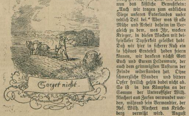 „Wir sollen und müssen Euch … schreiben, was Euch erhebt und stärkt, was Euch für so lange geduldig macht, als es not tut, nämlich bis ans’s Ende“, sagt der Großenwiedener Pastor, und fügt hinzu: „Ganz leicht ist das nicht immer.“ (Nr. 26.1917)