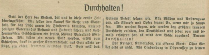 „Frieden ohne die Hohenzollern, das wäre die … Vernichtung Deutschlands. Das erleben wir nicht … In dieser Gewissheit gehen wir auch in das 5. Kriegsjahr, nach Gottes Willen.“ (Nr. 42.1918)