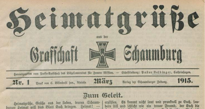 Die „Heimatgrüße aus der Grafschaft Schaumburg“1 erschienen von März 1915 bis Oktober 1918. Herausgegeben von der Diözese Rinteln und redigiert vom Pastor in Kathrinhagen (Auetal), wurden sie den Soldaten insgesamt 44 mal in die Schützengräben geschickt. Die etwa 10 Seiten starken Hefte enthielten einen oder mehrere überörtliche Leitartikel und danach die lokalen Beiträge aus allen 20 Kirchspielen der Diözese, die sich von Sachsenhagen im Norden über Oberkirchen im Nordwesten, Möllenbeck im Südwesten, durch das Auetal und durch das Wesertal von Rinteln über Hessisch Oldendorf bis Fischbeck vor die Tore Hamelns erstreckte.