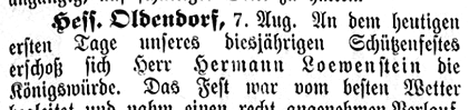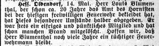 ... Herr Louis Blumenthal, der schon ca. 20 Jahre das Amt des Hornisten bei der hiesigen freiwillige Feuerwehr bekleidet hat, hat dieses besonderer Umstände halber abgegeben. Er war stets ein eifriges und pünktliches Mitglied und hat schon manchen Brand mitgelöscht. Hoffen wir, daß Herr Blumenthal noch viele Jahre ein tüchtiger Feuerwehrmann bleibt.