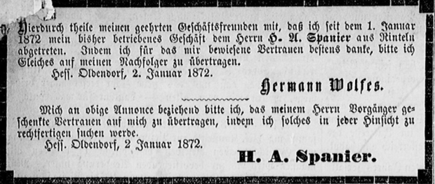 Das Handelshaus Lilienfeld war, wie berichtet, an den Schwiegersohn Wolfes übergegangen. Als dieser 1872 nach Hannover verzog, übernahm es der Kaufmann Hermann Abraham Spanier, der aus Rinteln kam, wo er Gemeindeältester gewesen war.