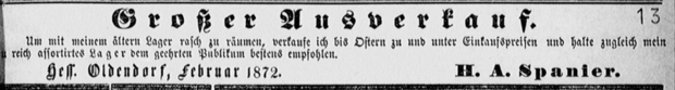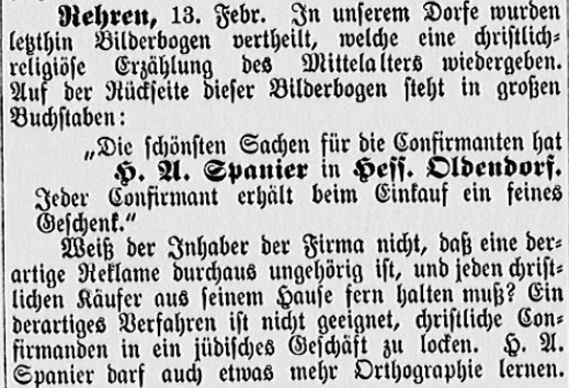 Spanier dürfte ein harter Wettbewerber gewesen sein. Im folgenden Inserat wehrt sich (vermutlich) ein Konkurrent aus Rehren A.O. mit antisemitischer Färbung, indem er darauf hinweist, dass Spanier k e i n c h r i s t l i c h e r, sondern ein j ü d i s c h e r Geschäftsmann ist.