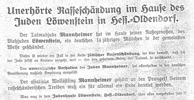 Im Jahr 1935 starten der Kreispropagandaleiter Koch und der Oldendorfer Sparkassenbeamte Rügge eine Hetzkampagne und behaupten, im Hause Löwenstein sei ein nichtjüdisches Mädchen vergewaltigt worden. Hetzplakate werden geklebt, eine Kundgebung auf dem Marktplatz wird veranstaltet und das Haus der Löwensteins angegriffen. Diese verlassen für einige Wochen die Stadt, um nicht gelyncht zu werden. Nur in der Kirchenchronik von Pastor Korff findet sich die Eintragung, dass die Aussagen des betroffenen Mädchens erlogen waren und das Untersuchungsverfahren eingestellt wurde.