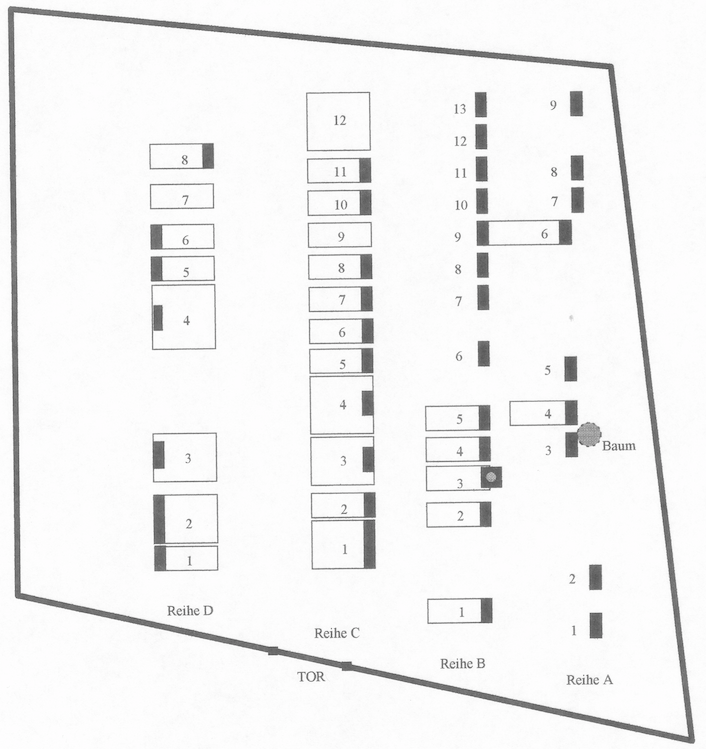 Betreten wir den Friedhof, so sehen wir, dass die Gräber in vier parallelen Reihen liegen und die Toten in Ost-West-Ausrichtung bestattet wurden. Bezeichnen wir die Reihen von West nach Ost mit A, B, C, D, so ist das auch die zeitliche Abfolge.