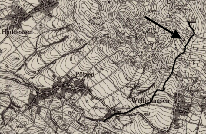 (Das Flurstück „Uf den Kolsteden“ bzw. „Kohlstätte“ bzw. „Kohlenstätt“, das sich auf diesen Karten südlich von Pötzen findet, dürfte auf Holzkohlen-Brennstätten evtl. auch auf einen "kalten" Ort zurück gehen.)