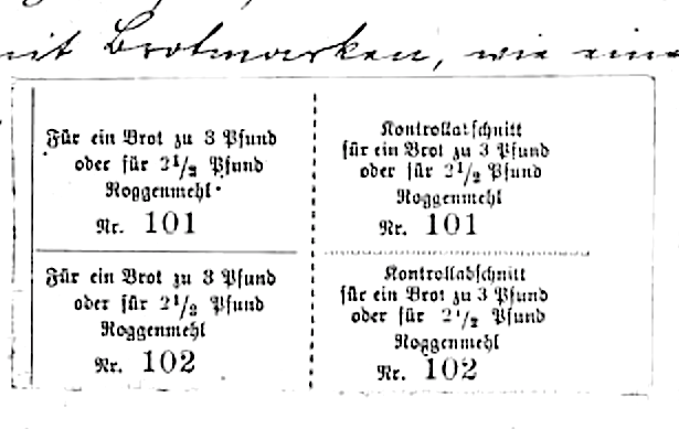 Der Bäcker darf nur gegen Brotmarken Brot verkaufen. Dabei muß jeder mit einer bestimmten Anzahl Brotmarken nur bestimmte Zeit auskommen, sodaß auf jede Person per Tag 1/2 Pfund Brot fällt. Brotkorn darf unter keinen Umständen zum Viehfutter verschrotet oder auf andere Weise verfüttert werden. Wer von den eifrig danach ausspähenden Gendarmen dabei ertappt wird, wird sehr schwer bestraft. Um mehr Brot zu erhalten, muß nach einer Verfügung beim Brotbacken dem Roggenmehl ein bestimmter Prozentsatz Kartoffelmehl zugesetzt werden. Es entsteht dann das sogenannte K.-Brot. Ebenso sind beim Backen von Weißbrot besonders strenge Vorschriften.