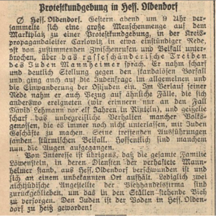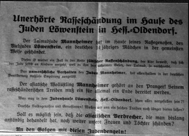 Das in Oldendorf und Umgebung verbreitete, sogar in Bielefeld aufgetauchte Blatt behauptete unter der Überschrift „Unerhörte Rasseschändung im Hause des Juden Löwenstein in Hess. Oldendorf!“, dass ein Angestellter der alteingesessenen Viehhandlung Löwenstein ein 14-jähriges „arisches“ Mädchen vergewaltigt habe. Der hetzerische Text fordert u.a.: „An den Galgen mit dem Juden Mannheimer!“