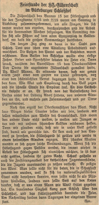 Der hiesige Rechtsanwalt Sxxxxxxx heiratete die Tochter des Apothekers Exxxx, eine kirchliche Trauung fand nicht statt, sondern eine NS-„Trauung“ im HJ- u. BDM-Heim am Kirchplatz.