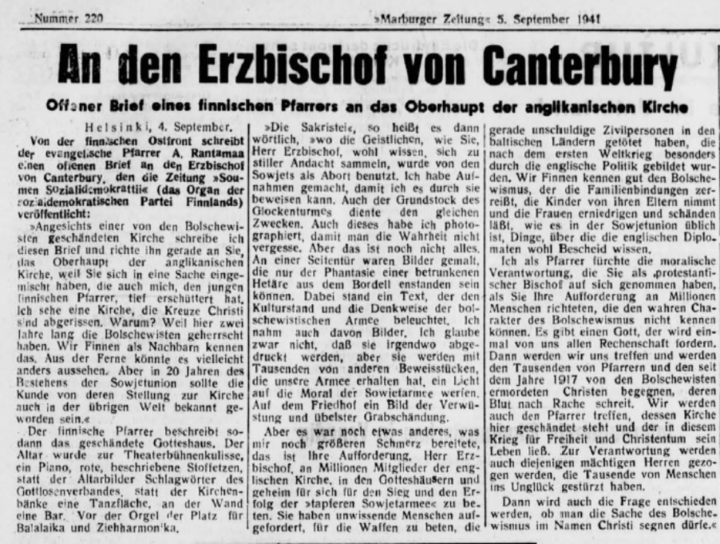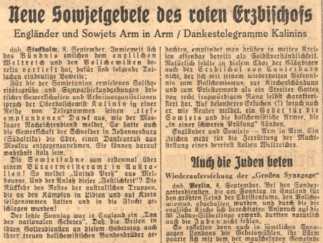 Leider ist es im Kampf gegen Rußland zu Dingen gekommen, die geeignet sind, der christlichen Kirche Schwierigkeiten zu bereiten, so wenn der Erzbischof von Canterbury und sein Prior ihre Stimmen für die Bolschewisten erheben oder wenn selbst Roosevelt im Gebet sich gegen uns wendet. Das wird im deutschen Rundfunk recht breit getreten, leider hört man hier aber nichts darüber, daß 2000 protest. Pfarrer in USA sich geweigert haben, die Waffen gegen Deutschland zu segnen. Wohl wird durch Rundfunk bekannt gegeben, daß der Erzbischof von Finnland sich gegen den von Canterbury gewendet hat.