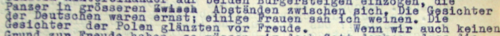 Inzwischen hatte der Gegner die Stadt betreten. Es fiel kein Schuss mehr. Die Besetzung der Stadt erfolgte ohne Zwischenfälle. Herrlicher Sonnenschein lag über unserem Tal. Die Bewohner standen an den Strassen und sahen sich wortlos das Schauspiel an, wie die amerikanische Infanterie einzeln hintereinander auf beiden Bürgersteigen einzogen, die Panzer in grösseren Abständen zwischen sich. Die Gesichter der Deutschen waren ernst; einige Frauen sah ich weinen. Die Gesichter der Polen glänzten vor Freude.