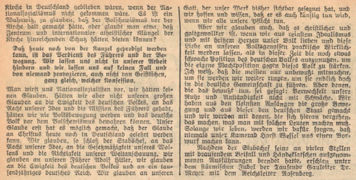 „Heute ist unser Volk erwacht, einig in allen seinen Stämmen, geleitet von einer starken Hand. Dafür wollen wir Gott von Herzen danken.“