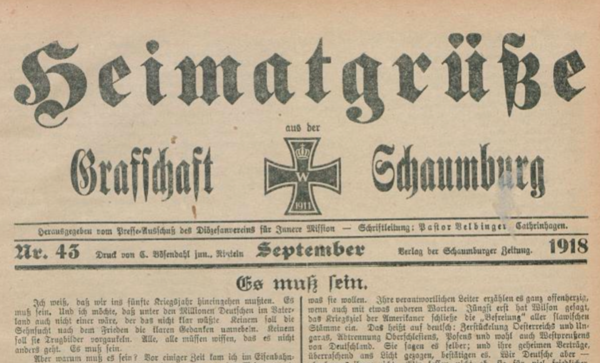 Die „Heimatgrüße aus der Grafschaft Schaumburg“1 erschienen von März 1915 bis Oktober 1918. Herausgegeben von der Diözese Rinteln und redigiert vom Pastor in Kathrinhagen (Auetal), wurden sie den Soldaten insgesamt 44 mal in die Schützengräben geschickt. Die etwa 10 Seiten starken Hefte enthielten einen oder mehrere überörtliche Leitartikel und danach die lokalen Beiträge aus allen 20 Kirchspielen der Diözese, die sich von Sachsenhagen im Norden über Oberkirchen im Nordwesten, Möllenbeck im Südwesten, durch das Auetal und durch das Wesertal von Rinteln über Hessisch Oldendorf bis Fischbeck vor die Tore Hamelns erstreckte.