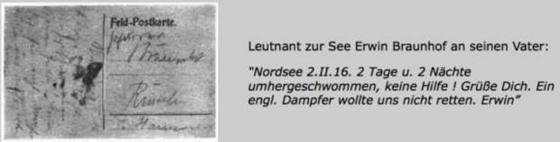 Der älteste Sohn, Leutnant zur See Erwin Braunhof, gehörte zur Besatzung des Luftschiffes L19, das im Februar 1916 nach Bombenabwürfen über England auf dem Rückweg in der Nordsee notwassern musste. Der Kapitän eines englischen Fischkutters sprach mit den Schiffbrüchigen, weigerte sich aber sie zu retten, angeblich aus Furcht vor der zahlenmäßigen Überlegenheit der sechzehn Deutschen. Bevor sie in der eiskalten Nordsee umkamen, schrieben sie Abschiedsbriefe, die ein halbes Jahr später als Flaschenpost in Schweden aufgefischt wurden.5