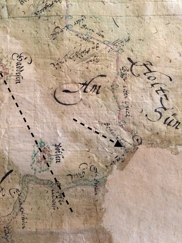 Hier eine Karte von 1731. Der Grenzverlauf ist blau eingezeichnet, und daraus ergibt sich wieder die Stelle der Kohlengrube (Pfeil):