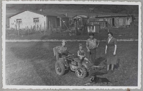 Wilhelm und Else Röhl mit ihren beiden Söhnen vor ihrem Anwesen mit Wohnhaus und Hühnerfarm.