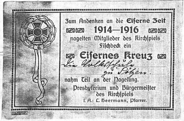 Um auf andere Weise Geld zusammenzubringen, wurde im Frühjahr 1915 in einzelnen Städten damit begonnen, in hölzerne Standbilder usw. Nägel einzuschlagen. Jeder konnte Nägel einschlagen und mußte dafür bestimmte Beträge entrichten. So entstand in Berlin der „eiserne Hindenburg“, in Hamburg der „eiserne Roland“ usw. Meistens wurden aber eiserne Kreuze genagelt. Auf Anregung des Herrn Pastor Heermann in Fischbeck wurde in den Weihnachtstagen 1915 in der Kirche zu Fischbeck mit der